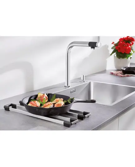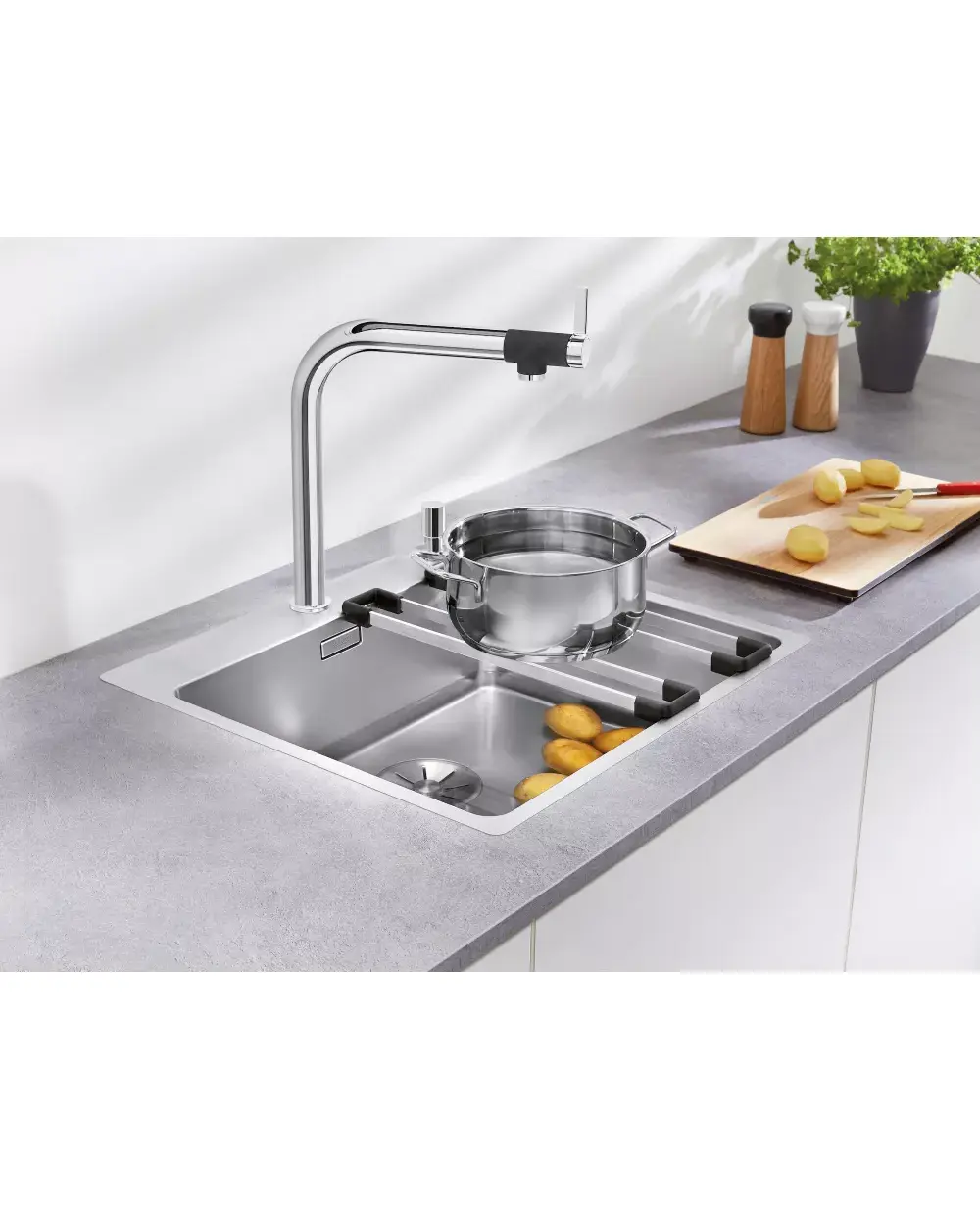 • Располагаемые на краях чаши держатели превращаются в мостик через мойку, позволяя работать на двух уровнях.