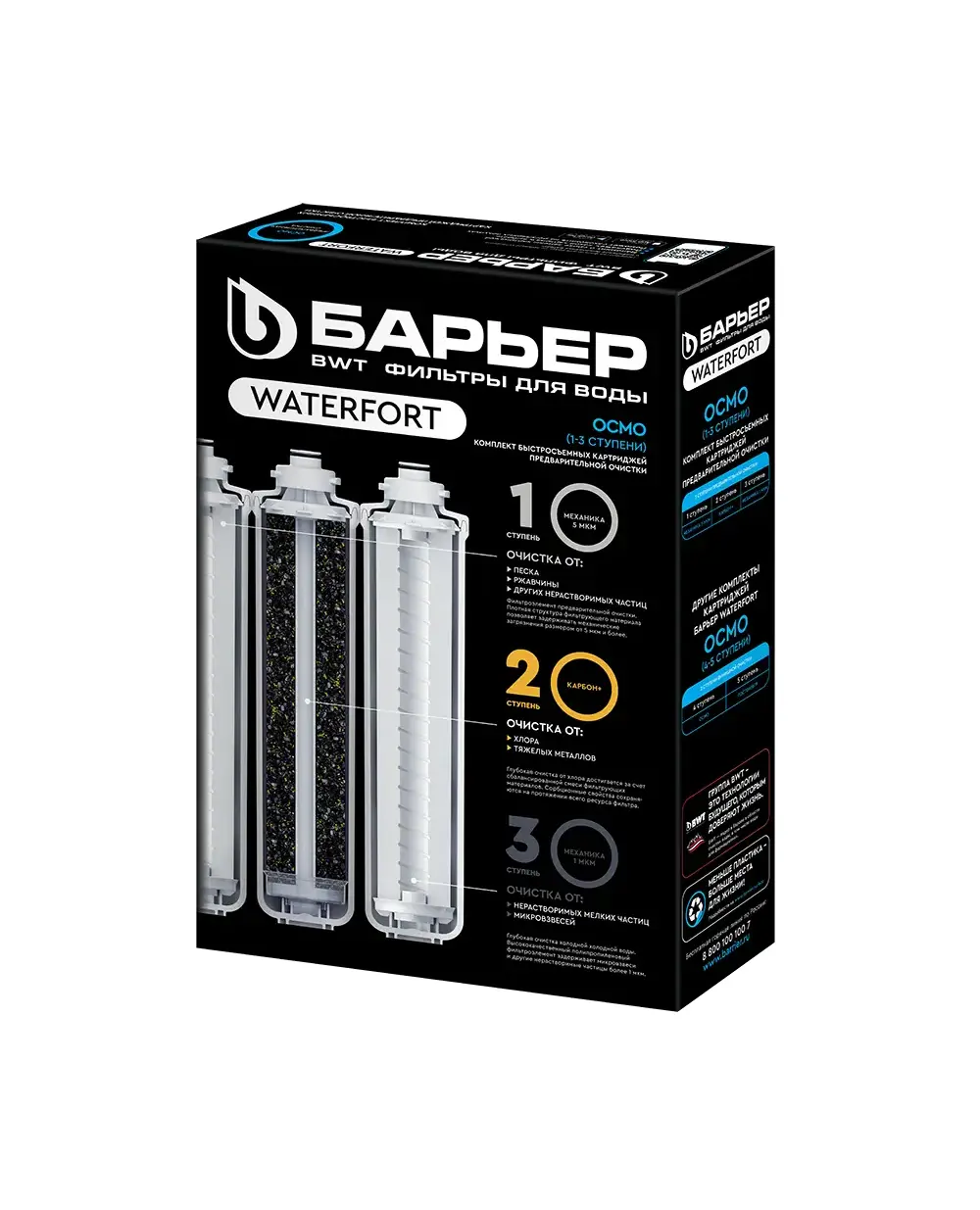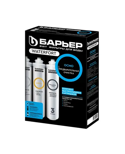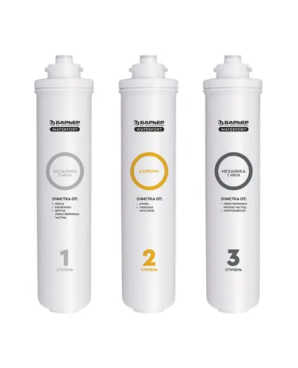 Комплект картриджей для обратноосмотического фильтра БАРЬЕР WaterFort. Устанавливается в качестве 1-3 ступеней, подготавливает воду к обратноосмотической мембране. Не требует специальных инструментов для замены. В комплект входит:  "БАРЬЕР WaterFort Механика" удаляет любые механические примеси до 5 мкм (песок, ржавчину и другие механические примеси). "БАРЬЕР WaterFort Карбон+" - защита мембраны от хлора. Удаления хлора и хлорорганических соединений, тяжелых токсичных металлов. "БАРЬЕР WaterFort Механика 1 мкм» - финишная механическая очистка от мелкодисперсных взвесей размером более 1 мкм. Ресурс комплекта до 12 месяцев.