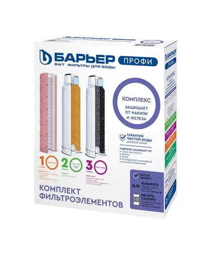 Картриджи стандарта SlimLine 10’’ для доочистки железистой и жёсткой воды. Эффективно удаляют как растворённое (двухвалентное), так и коллоидное (трёхвалентное) железо. Умягчают воду. В комплект входит: 1."БАРЬЕР ПРОФИ Ферронить" навитой материал с прочными ионообменными связями для удаления растворённого и коллоидного железа при высоких концентрациях – до 3 ПДК (до 0,9 мг/л). 2."БАРЬЕР ПРОФИ Смягчение" предотвращает образование накипи. Эффективно снижает карбонатную жесткость, из-за которой образуется осадок в чайнике. Средний ресурс ступени по жесткости до 6 месяцев. Фильтроэлемент «Смягчение» (вторая ступень) может быть подвергнут многократной регенерации раствором поваренной НЕ йодированной соли в домашних условиях. 3."БАРЬЕР ПРОФИ ПостКарбон" - финишная очистка и кондиционирование, устранение неприятных привкусов и остаточного хлора.