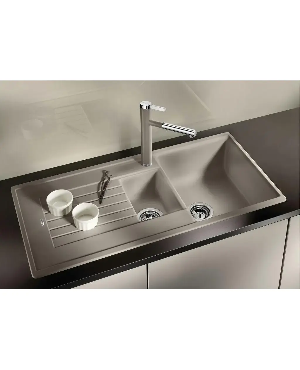• • Классическое расположение чаш делает мойку оборачиваемой